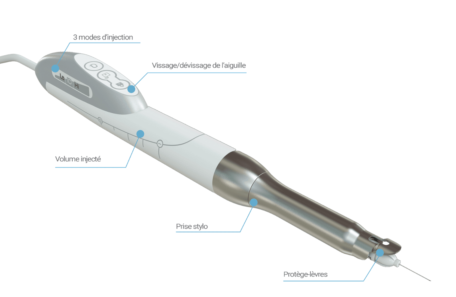 Il dispose d’une fonction exclusive qui permet de mettre l’aiguille en rotation pour traverser facilement et sans douleur la corticale osseuse.